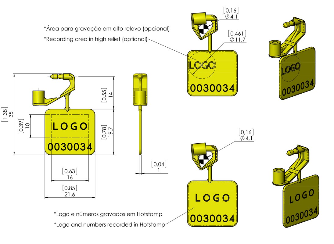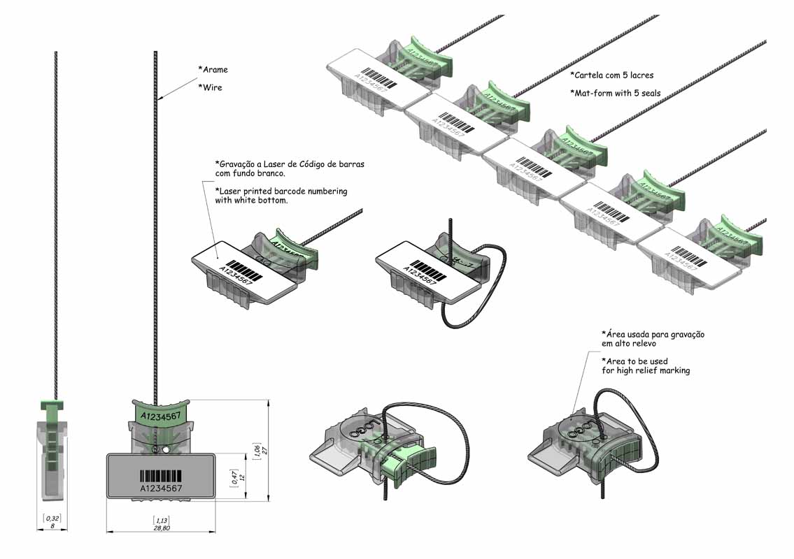 Alock W CB # 028B12813ST2PC – codificação alfanumérica + dígito verificador na cápsula com código de barras na cápsula (externamente) e numeração a laser na âncora (internamente) e personalização na cápsula gravados à laser, com arame inox espiralado 2 fios acoplada ao lacre, nas medidas padrão, variando de 13 à 79 cm.