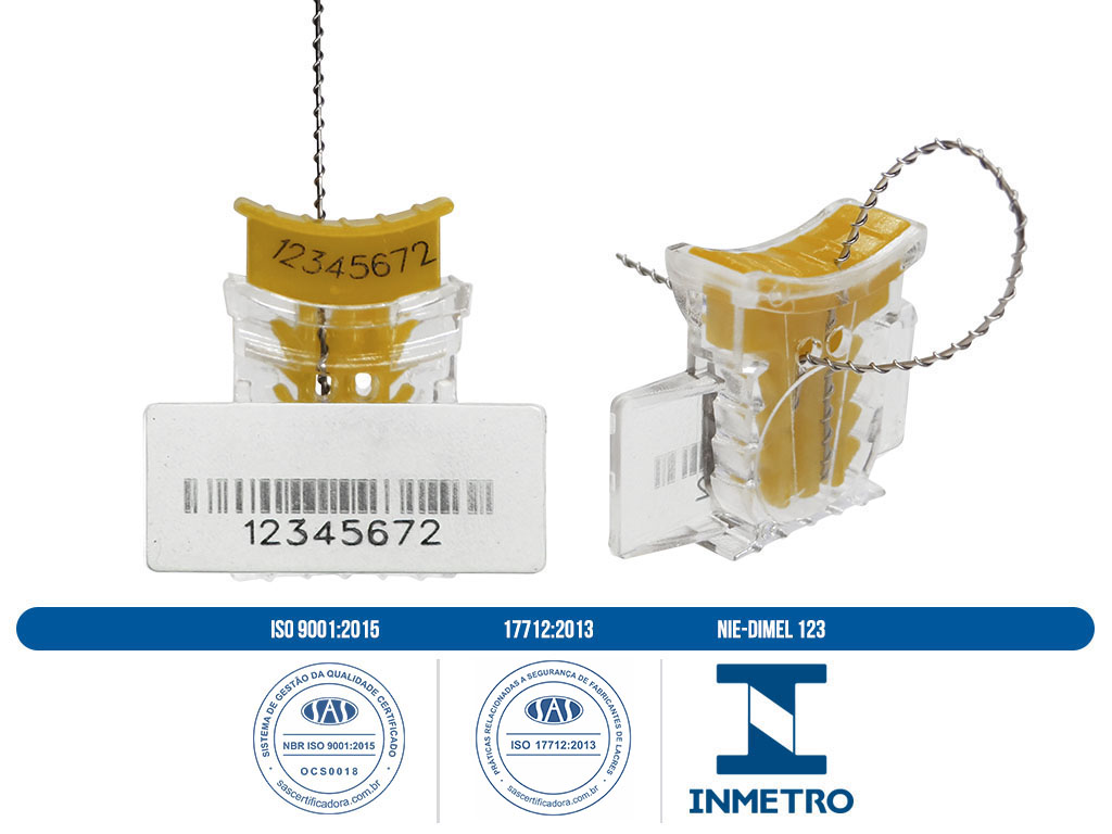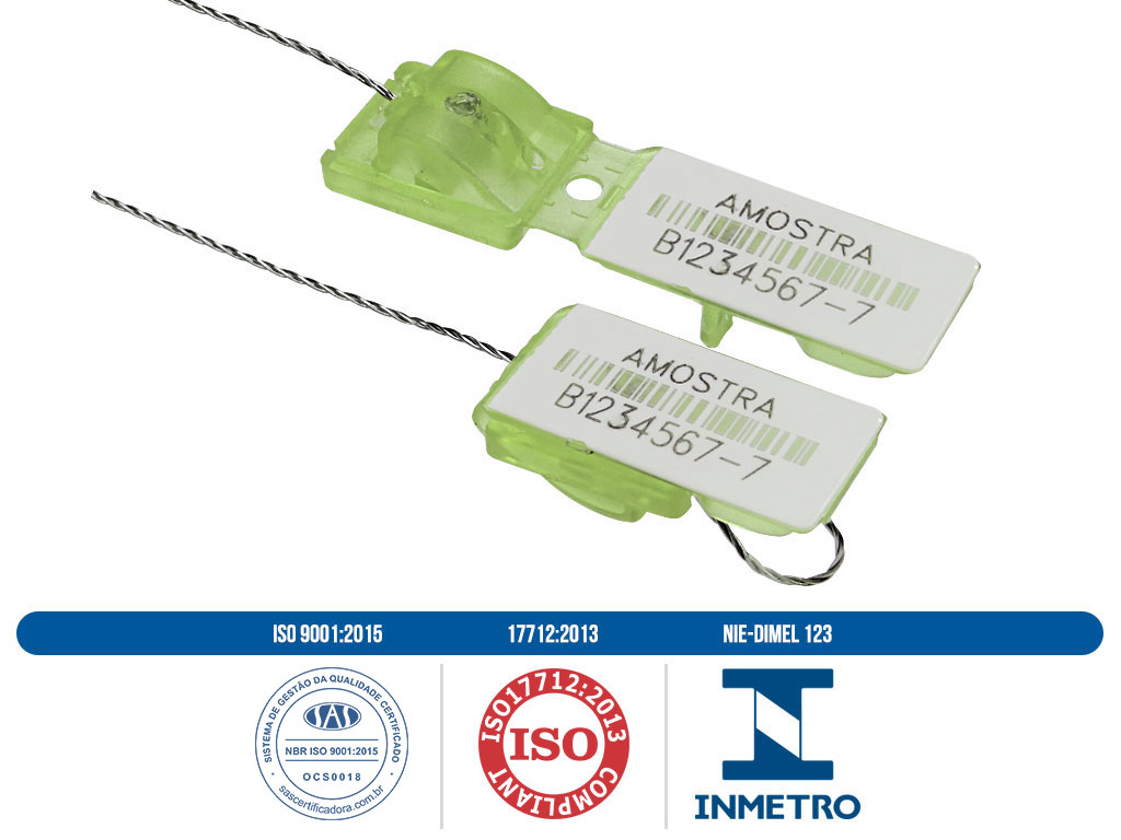 Selo de segurança Safelock M SLM #072SLM1520GVPC - selo de segurança semibarreira, cabo de lacração em aço galvanizado 7 fios que se desfaz com o corte impossibilitando sua recomposição, comprimento de 20 cm e diâmetro de 1,50 mm. Personalização, codificação alfanumérica gravados à laser no corpo do selo, resistência a tração mínima de 227 daN.