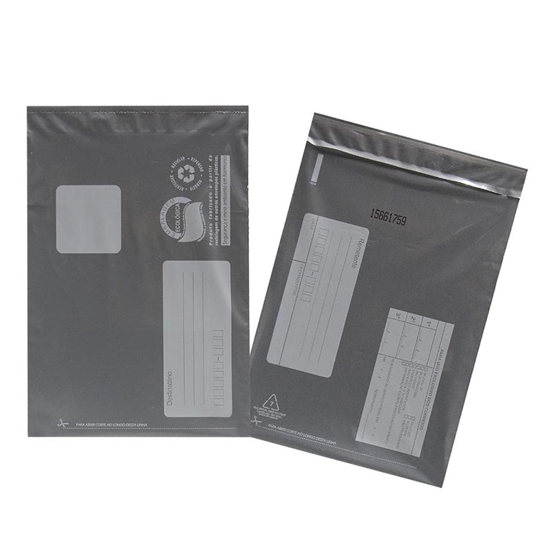 Envelope plástico em 4 tamanhos, cor cinza opaco com área de endereçamento branca, marcada "Remetente" e "Destinatário", para uso de esferográfica.