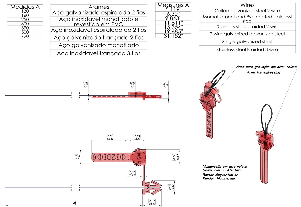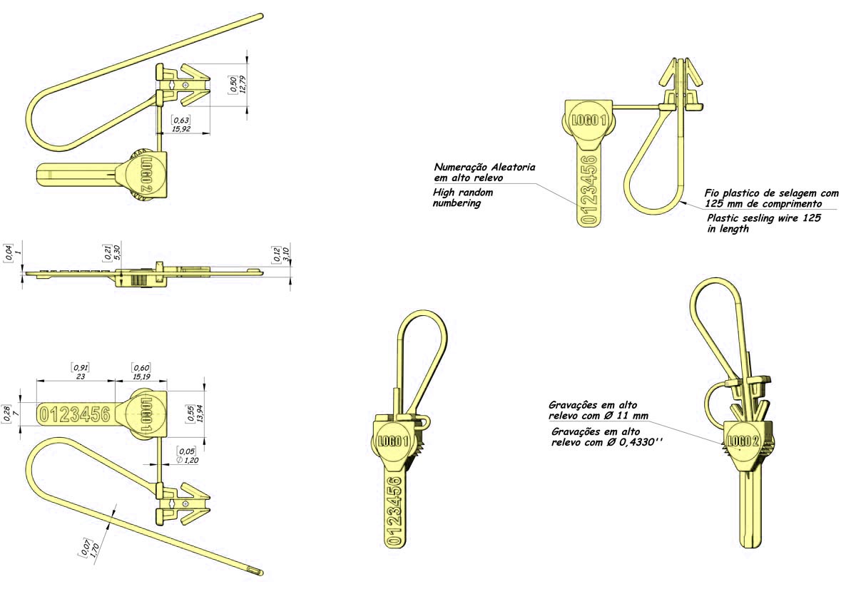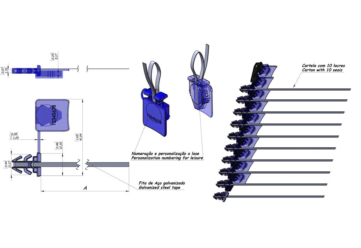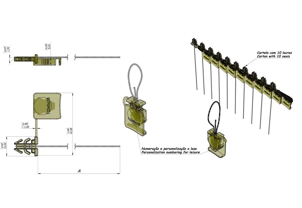 Lacre de segurança compostos de lâmina, cápsula, âncora em polipropileno, opções de arames, fitas e fios plásticos de selagem, numeração em alto relevo.