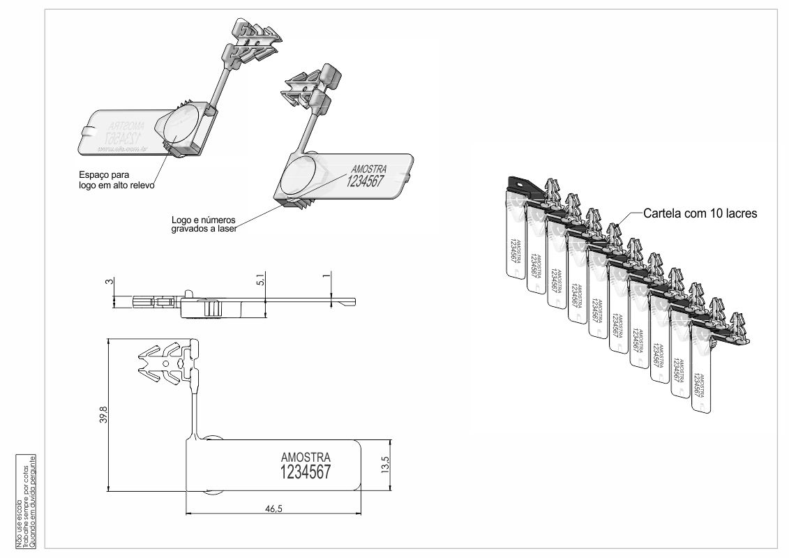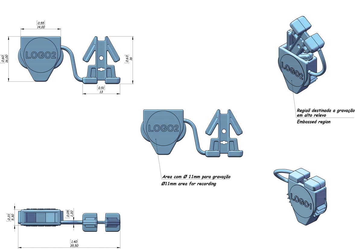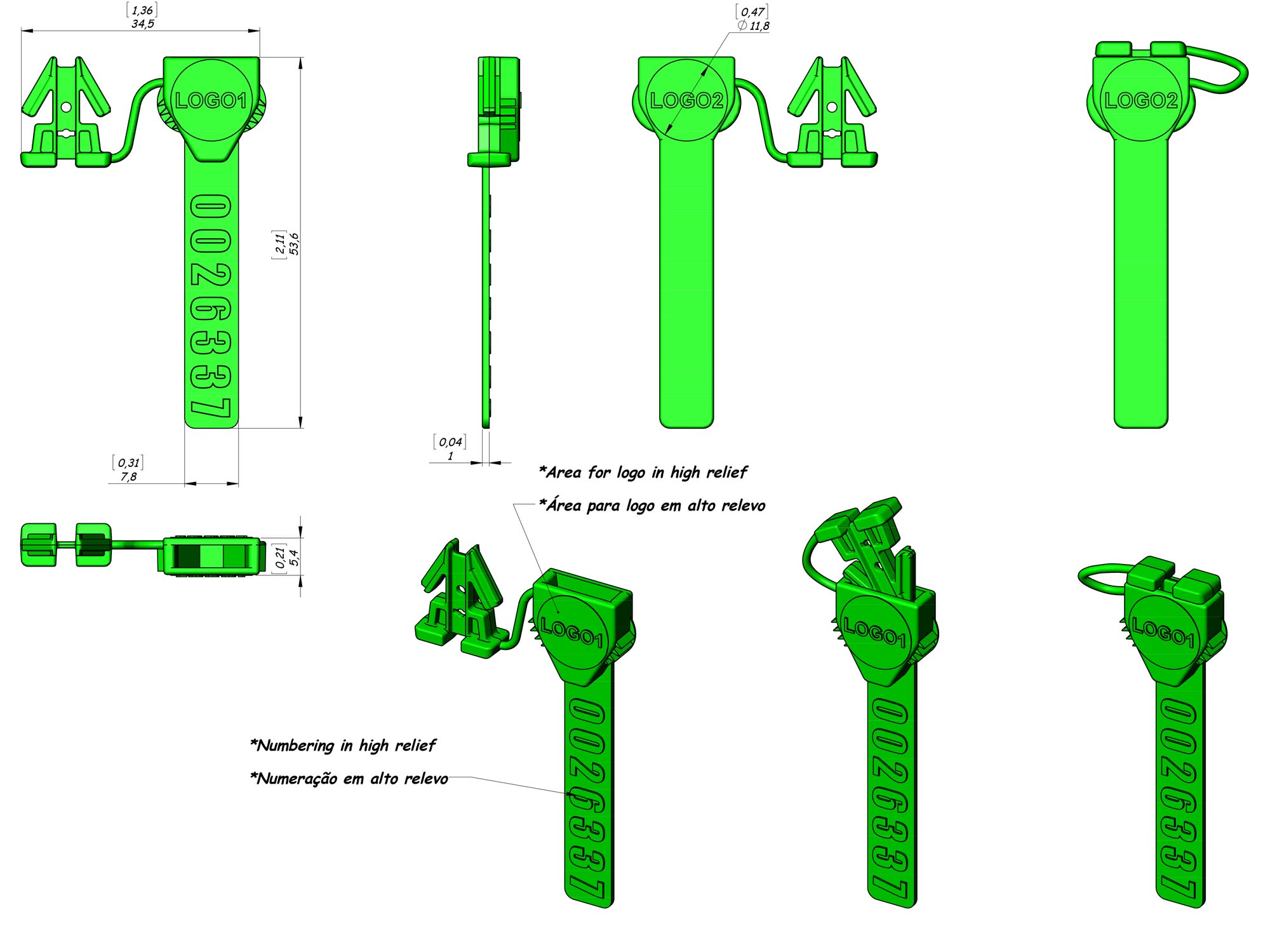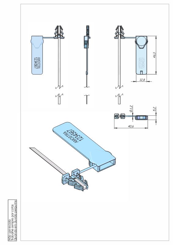 Lacre de segurança compostos de lâmina, cápsula, âncora em polipropileno, opções de arames, fitas e fios plásticos de selagem, numeração em alto relevo.
