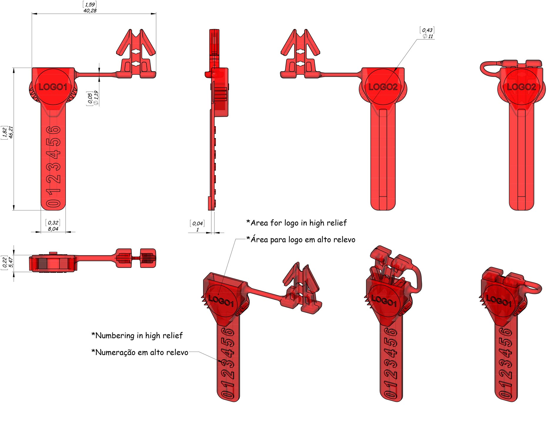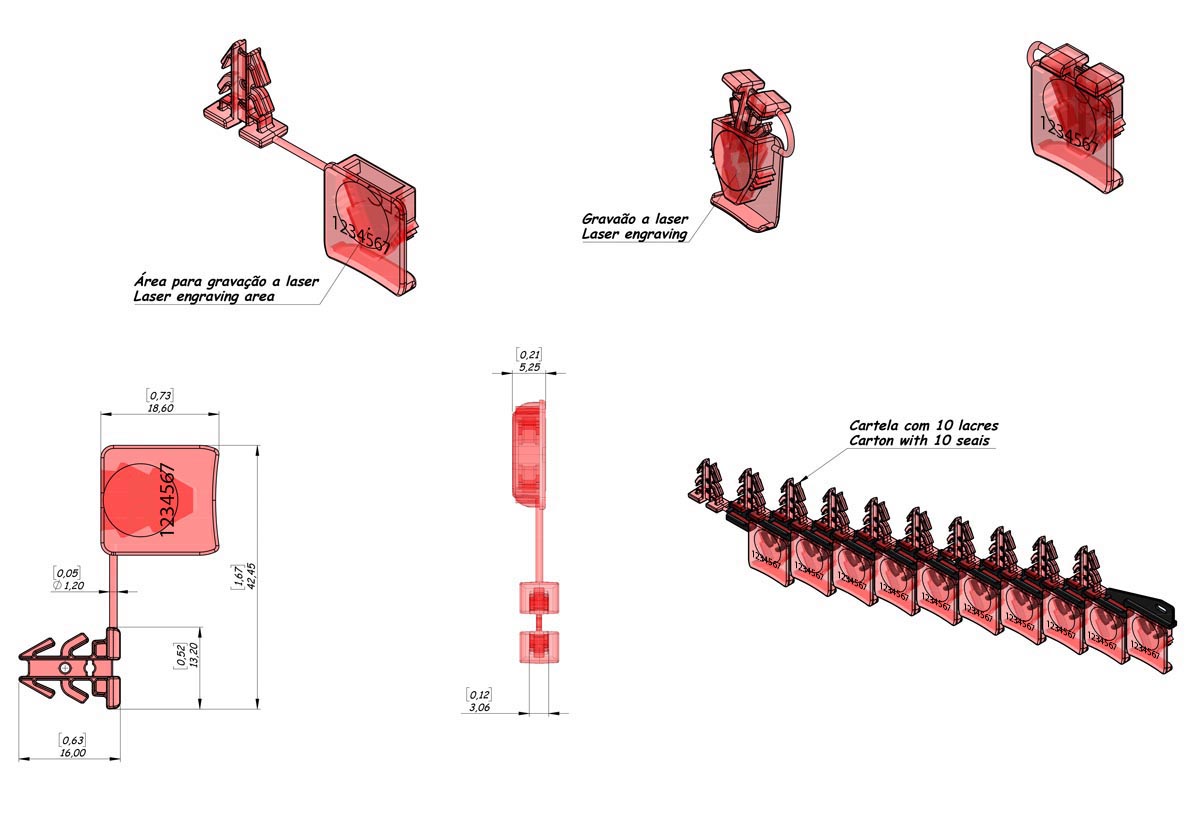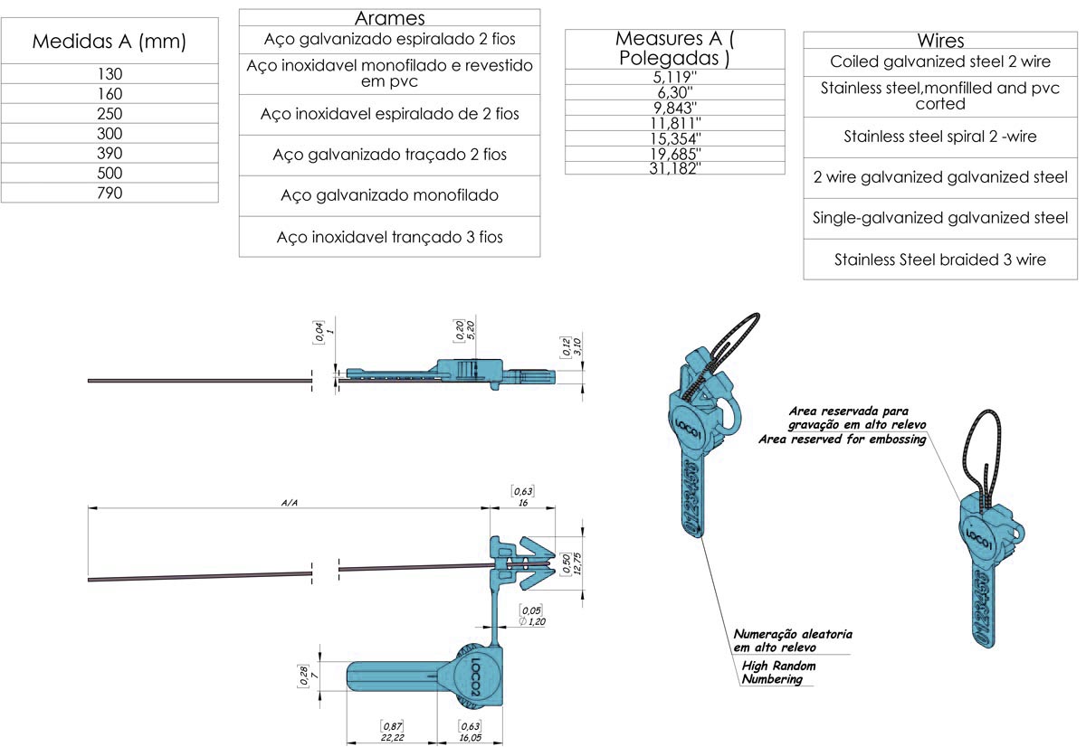 Lacre de segurança compostos de lâmina, cápsula, âncora em policarbonato, opções de arames, fitas e fios plásticos de selagem, numeração em alto relevo.