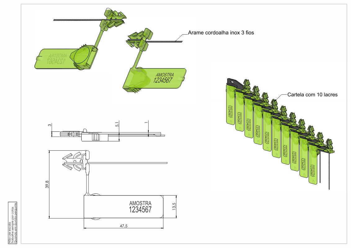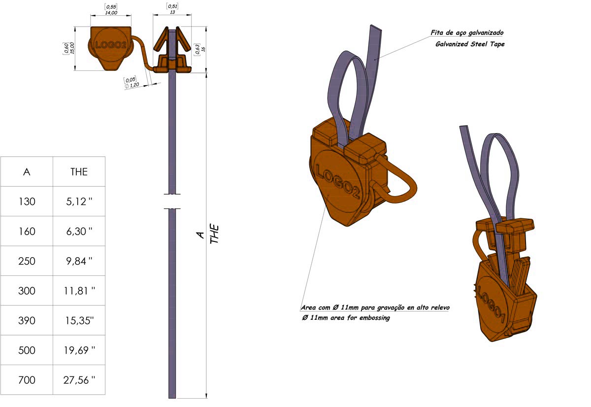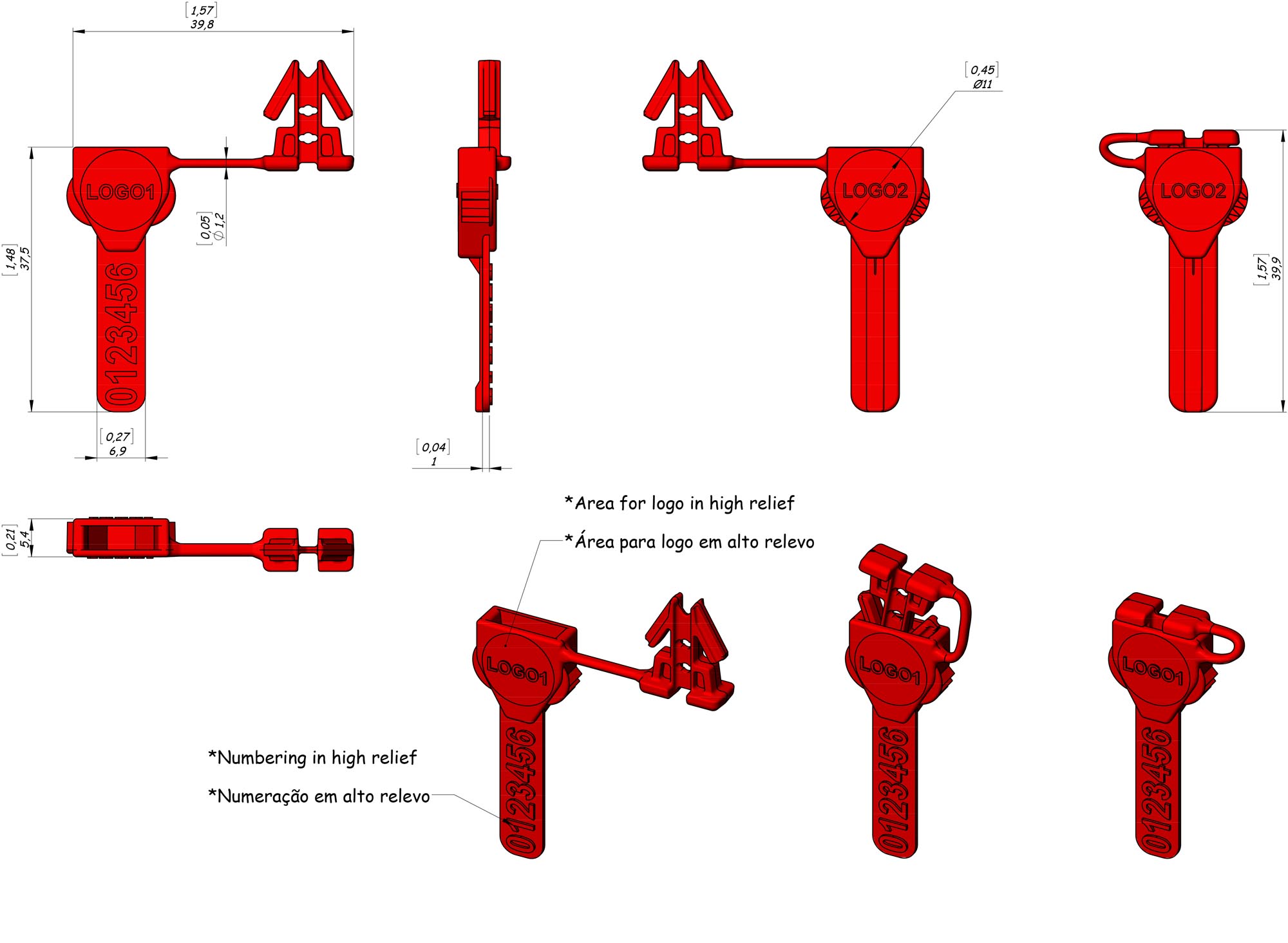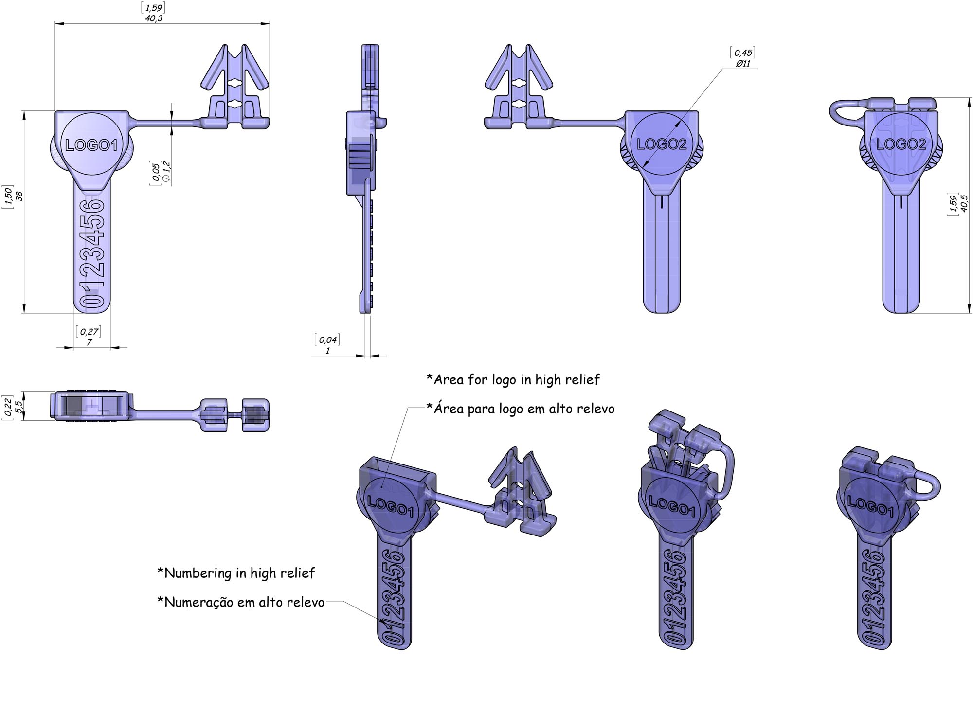 Lacre de segurança compostos de lâmina, cápsula, âncora em policarbonato, opções de arames, fitas e fios plásticos de selagem, numeração em alto relevo.