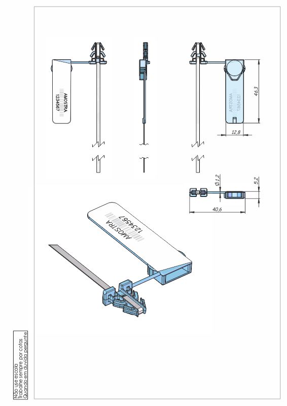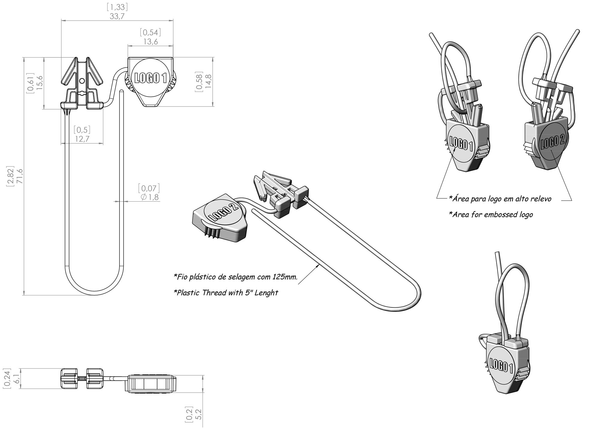 Lacre de segurança compostos de cápsula, âncora e opções de arames, fitas e fios plásticos de selagem, sem numeração.