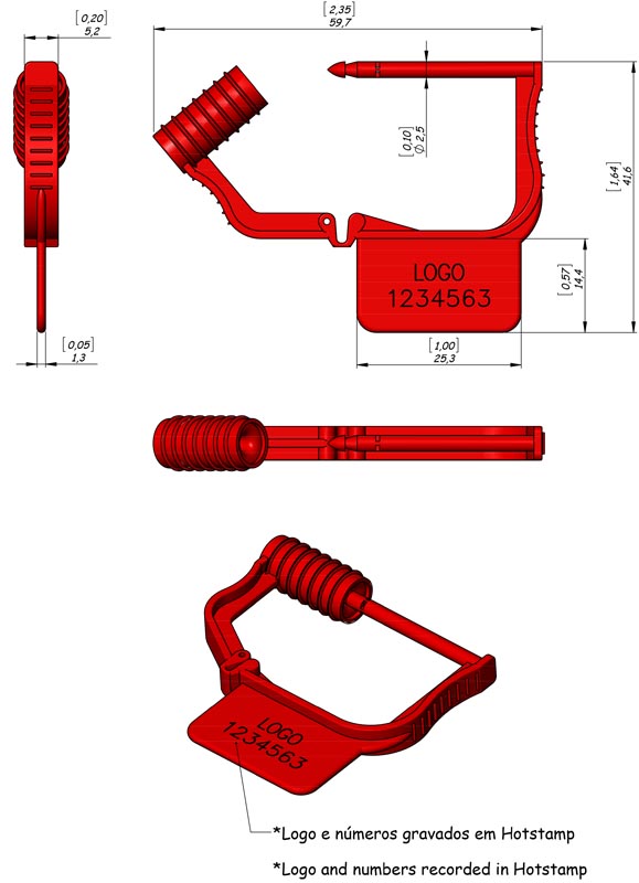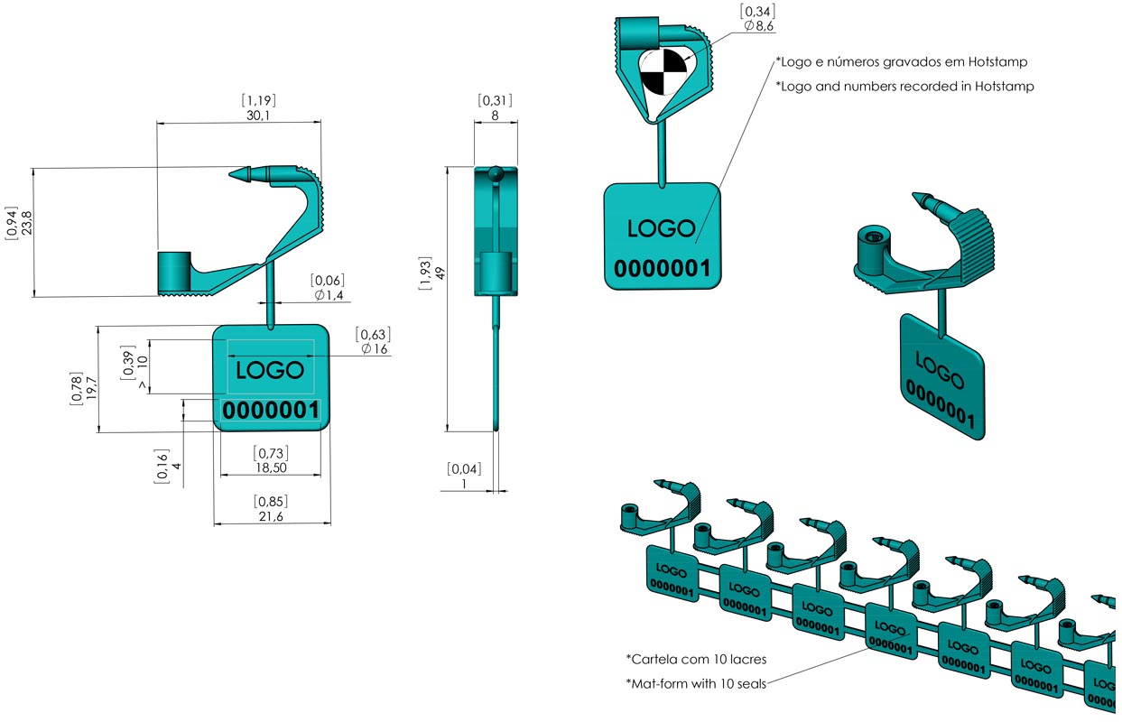 Aplicação com uma só mão, opção de numeração em código de barras ou "hot stamp", fornecidos em cartelas de 10 lacres interligados.