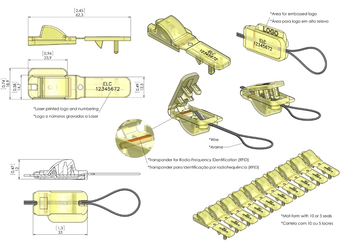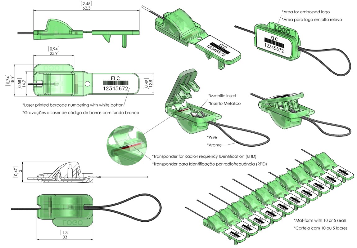 Os lacres de segurança E-Lock Fabricados em policarbonato, com ID interno para leitura usando um terminal de coleta de dados portátil, ou mesmo um leitor de passagem. Codificação de códigos de ID únicos e programados por laser. A codificação alfanumérica gravada no lacre, composta de 10 dígitos alfanuméricos aleatórios e sem repetição, é a mesma do microtransponder. Esta é permanente e inalterável.