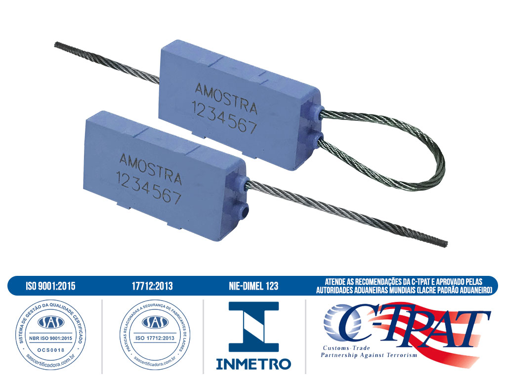 Lacre metálico em conformidade com a ISO 17712:2013, corpo em policarbonato, mecanismo de travamento metálico, blindado independente, com cabo de lacração em aço inox ou galvanizado 7 fios, com diâmetro de 1,50 mm e comprimentos variados conforme necessidade. Resistência a tração mÃnima de 227 daN.