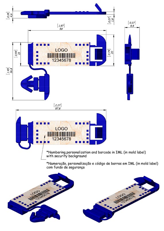 Lacre de Segurança SS-02 #SS02B128PP - Selo de segurança com a lâmina codificada com 8 dígitos numéricos e código de barras pelo processo IML (In - Mold - Label).