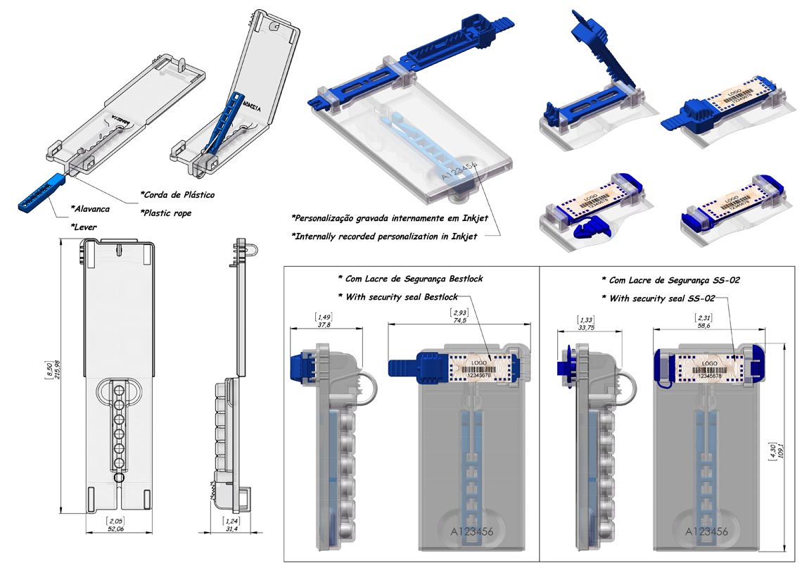 Composto de um porta-rótulo (PR-02), corda de nylon ou corda injetada, alavanca de graduagem de aperto e selos de segurança (Plik e SS-02).
