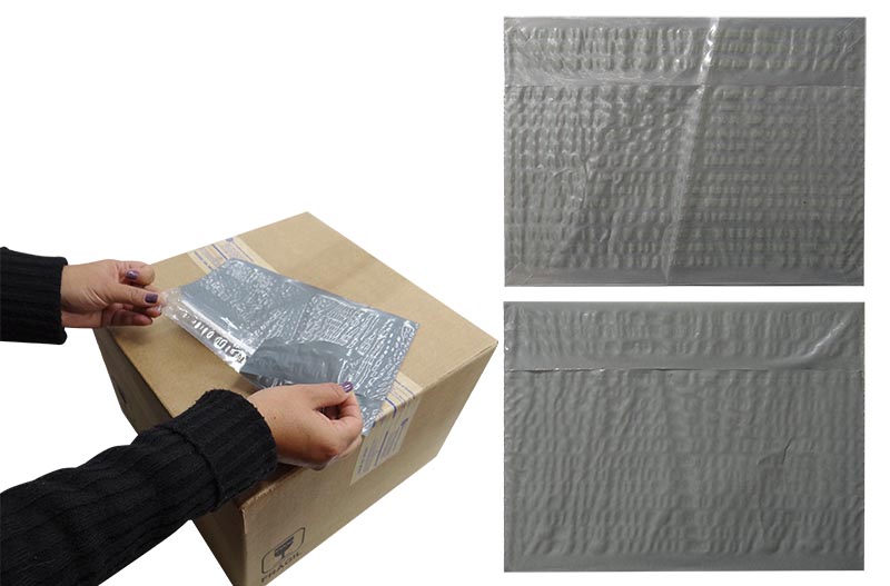 FLEX #252185 - Envelope plástico tipo fronha com abertura no mesmo lado dos adesivos: neste caso, após colocação do documento no interior do envelope e fixação deste na caixa, o torna inviolável (apenas para visualização do documento), sendo necessário rasgá-lo para retirar o documento. Neste caso o documento pode ser retirado da caixa somente no destino final.