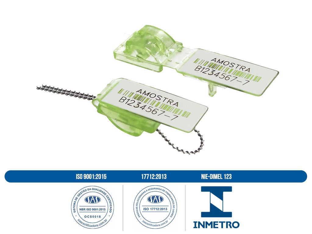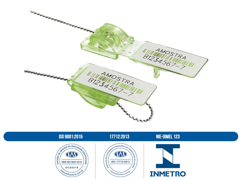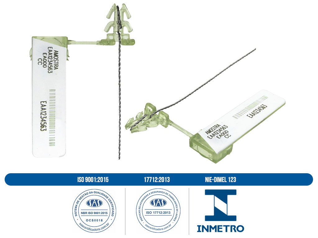 – com código de barras , codificação alfanumérica + dígito verificador e personalização a laser. Com arame inox espiralado 2 fios de 13 cm de comprimento, fixado internamente ao lacre através de clip metálico.