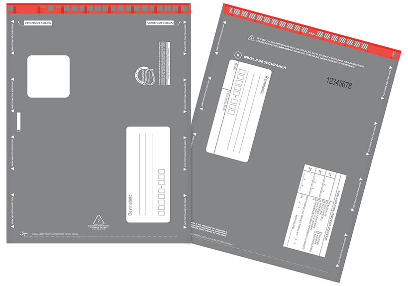Envelopes com áreas de endereçamento para escrita esferográfica marcadas com DE e PARA, além de intruções de segurança e manuseio.