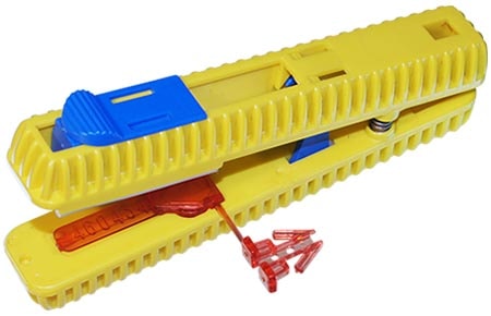 Lacre de segurança compostos de lâmina, cápsula, âncora em policarbonato, opções de arames, fitas e fios plásticos de selagem, numeração em alto relevo.