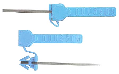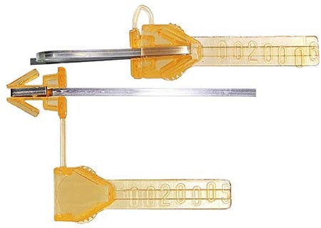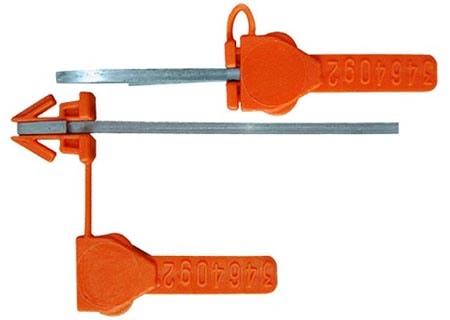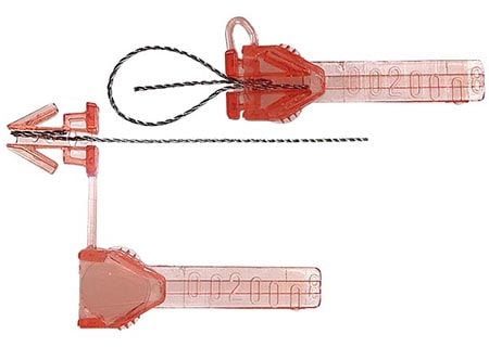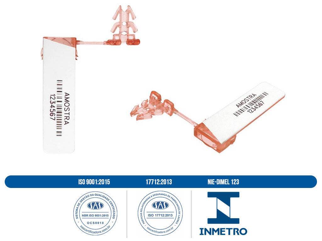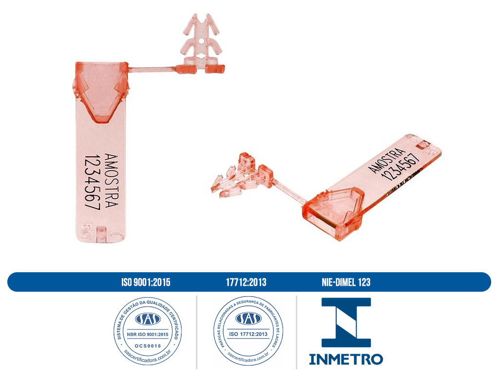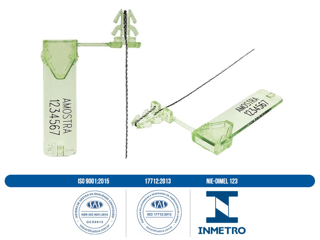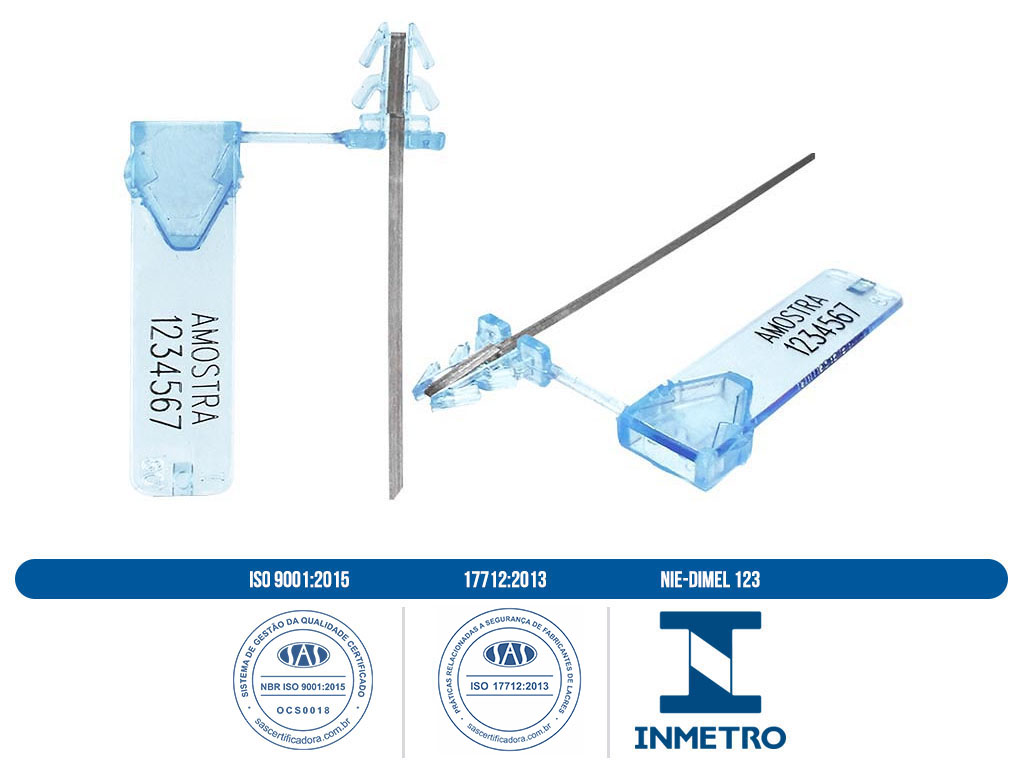 Lacre de segurança compostos de lâmina, cápsula, âncora em polipropileno, opções de arames, fitas e fios plásticos de selagem, numeração em alto relevo.