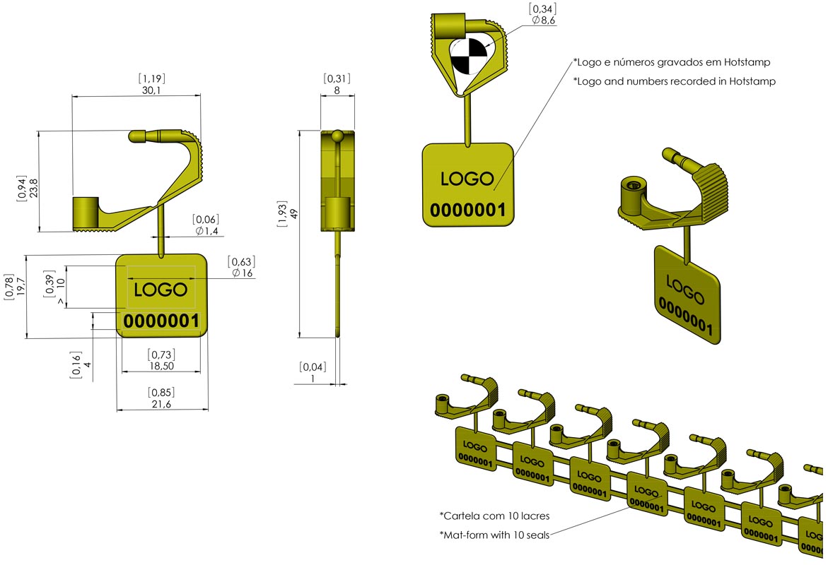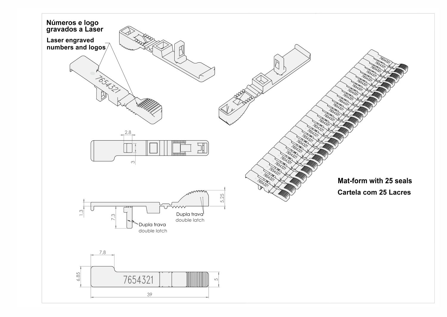 Aplicação com uma só mão, opção de numeração em código de barras ou "hot stamp", fornecidos em cartelas de 10 lacres interligados.