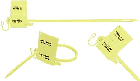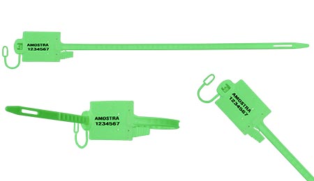 Lacre plástico com rabicho de aperto ajustável para diversas aplicações. Identificação estampada em baixo relevo sobre a lâmina do lacre.