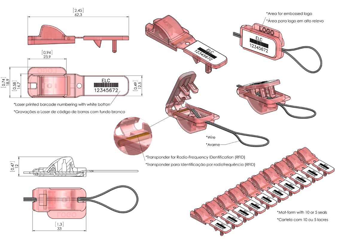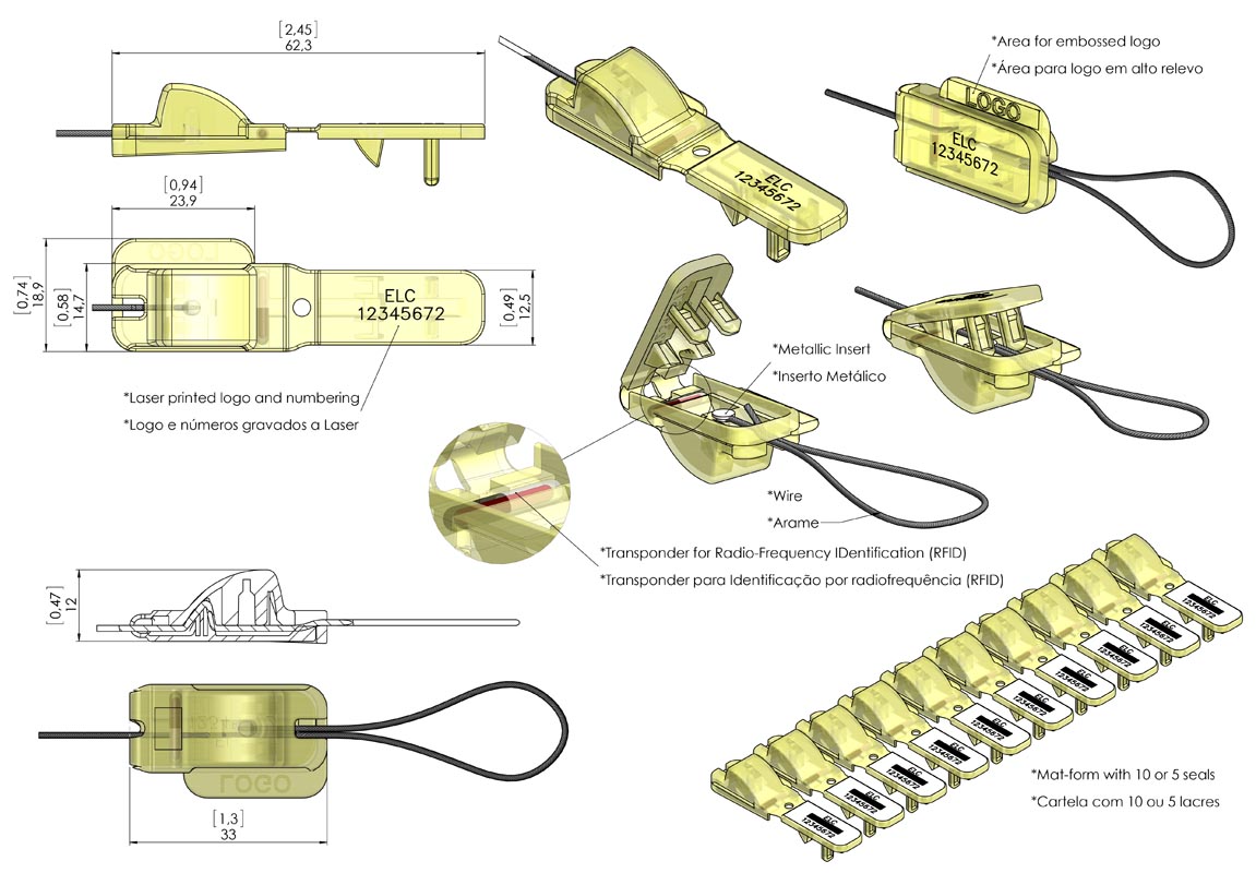 Os lacres de segurança E-Lock Fabricados em policarbonato, com ID interno para leitura usando um terminal de coleta de dados portátil, ou mesmo um leitor de passagem. Codificação de códigos de ID únicos e programados por laser. A codificação alfanumérica gravada no lacre, composta de 10 dígitos alfanuméricos aleatórios e sem repetição, é a mesma do microtransponder. Esta é permanente e inalterável.