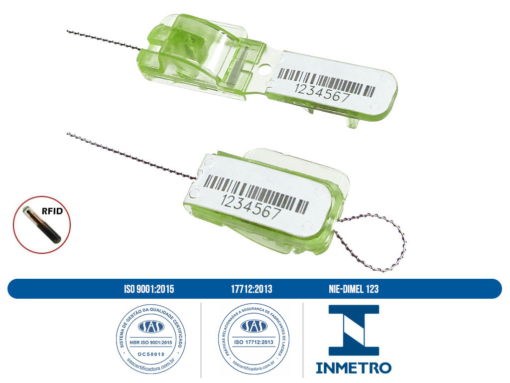 084SLM13ST2PCRFID | Lacre E-Lock 5 | Laser | Laser | Arame inox fixado internamente através de um clip metálico |