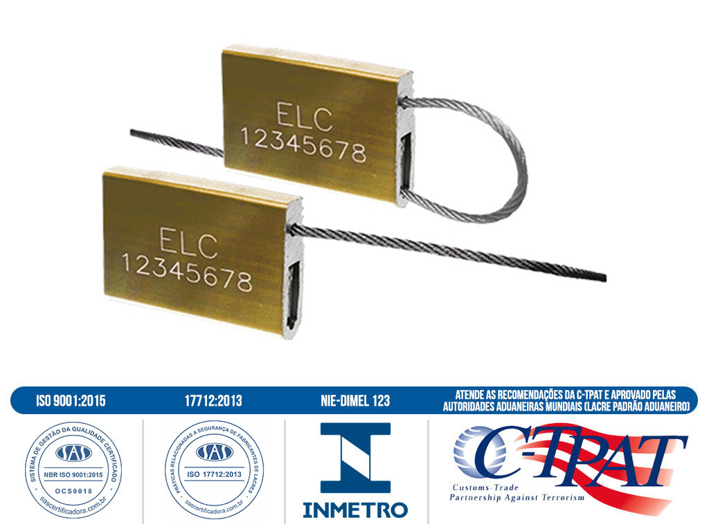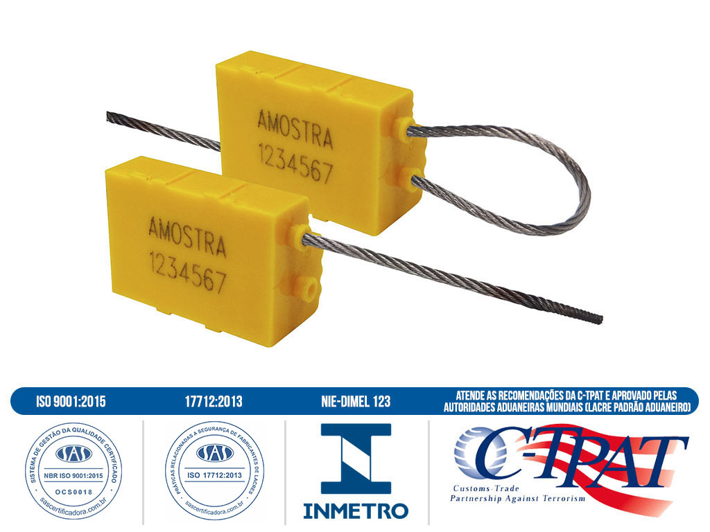 Lacre metálico em conformidade com a ISO 17712:2013, corpo em policarbonato, mecanismo de travamento metálico, blindado independente, com cabo de lacração em aço inox ou galvanizado 7 fios, com diâmetro de 1,50 mm e comprimentos variados conforme necessidade. Resistência a tração mÃnima de 227 daN.