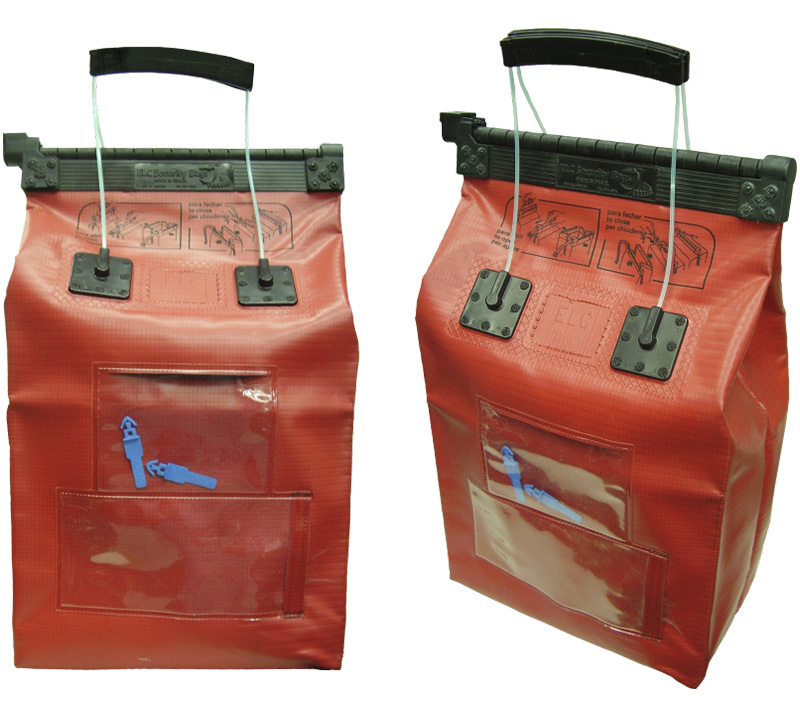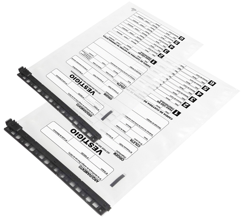 Envelope co-extrusado em polipropileno com 300 microns de espessura (150 por parede), com sistema de fechamento plástico reutilizável, lacrado com selo Newlock.